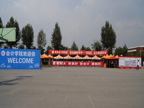 早上六点左右,学生会的工作人员在操场上陆续搭起帐篷,立起贴有《2012级分班情况表》《新生入学指南》《线上赌场 简介》的展板,挂起印有“新财大 更美好 新会计 展新貌”的横幅,有条不紊地迎接着新生的到来。