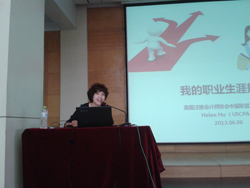 此次讲座的主题为“高端财务人才发展方向及行业未来发展趋势”。胡玉华老师以职业生涯规划为出发点,先后从四个方面向我们介绍了本次讲座的相关内容。首先,胡玉华从自己的亲身经历讲到“职场教给了我什么”,告诉我们应从现在开始设定自己的职业生涯目标,并去享受实现目标的过程;其次,她对现场同学们的职业理想进行调查,一起畅谈了职业理想;第三,胡玉华着重讲解了如何使自己在众多的应聘者和同事中脱颖而出,并从学习、实习、简历、面试、工作能力等不同的角度向大家阐述了应如何准备才能从与他人的竞争中取得先机;第四,胡玉华简单地介绍了美国注册会计师(U.S CPA)的相关情况,她最后总结到“拥有美国会计师资格的国际会计人才在国内的职场发展前景是非常好的,希望广大的山东财经大学会计学子们认识到这一点,并努力提高自身的竞争力”。