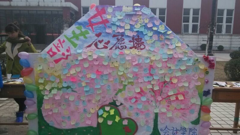 心愿墙活动是女生部的传统活动,此活动旨在在这个寒冷的冬天传递一份温暖,给大家送来一丝关怀。此次活动面向全校师生,邀请大家在心愿墙上写下自己的心愿,同时也鼓励大家帮助别人实现心愿,虽然寒风瑟瑟,但是同学们都因为心怀愿望而笑容满面。心愿墙虽小,却承载了满满的师生情、社团情、同窗情,在心愿墙上,我们看到了“美食达人”对美食的期待,好闺蜜们对感情长久的期待,情侣们恩恩爱爱的甜蜜,老师对同学们的殷切期盼……