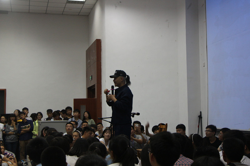 晚七点,在同学们的热烈的掌声和欢呼声中,大冰身着黑色风衣、戴着帽子走进了明水5201教室。一出场,大冰就亲切地与现场观众打招呼,听到许多同学没有吃晚饭,当场把自己的晚餐赠予现场的观众,引来现场的不住欢呼。温馨的开场后,随着与同学们畅聊的深入,为同学们所熟识的大冰更展现了自己幽默、随性、智慧的独特魅力。