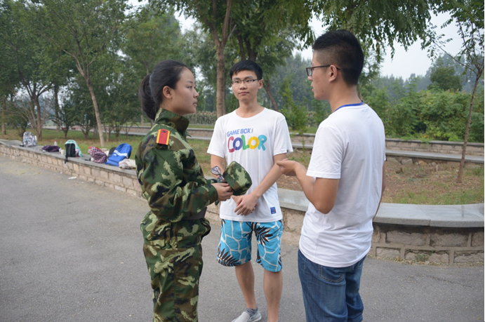 整个训练场,教官,新生,医务人员,首长构成亮丽的风景线。而作为工作人员的学生团体,也就是我们亲爱的大二带班们,牺牲自己的时间,依旧在训练场陪伴新生,及时解答他们的疑惑。等待与观望肯定是无聊的,但是为了新同学的利益,为了自己的职责,他们选择坚持。审计1601带班李昱喆在值班期间积极解答新生安俐杰同学的疑惑,给新生精神上的温暖与鼓励。通过安同学的话,我们了解到带班的辛苦与负责,也向他们表达深深的敬意。你若问他苦不苦,他答,不苦,服务新生最美妙。