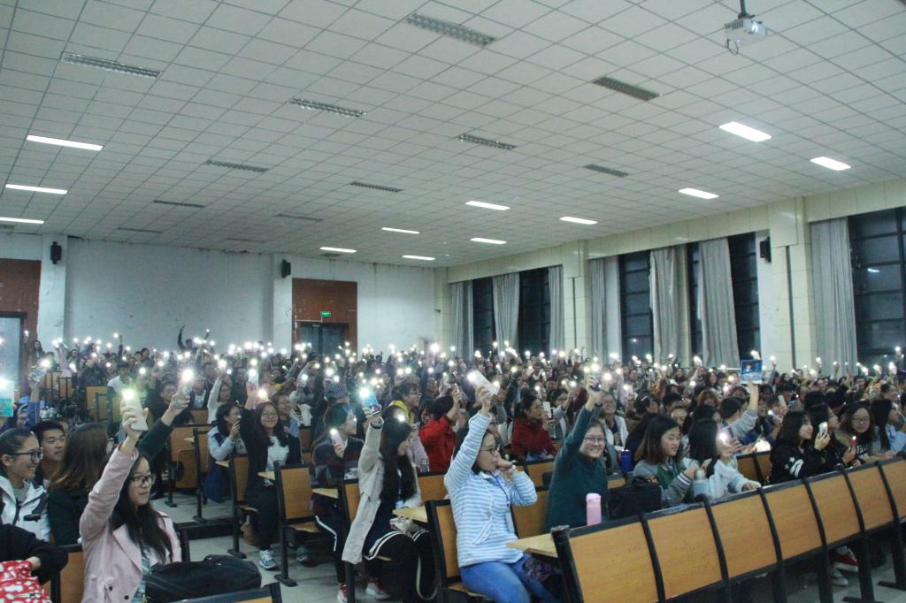 谈到他的大学时代,果子弹奏了一首有趣的歌:《新鲜的学妹你们好,我是坏学长》,歌曲明快,灵动,充满了青春的活泼与肆意;“没有你的生活,我一定会好好的,至少现在我还唱着为你写的歌。”《大男孩》讲出关于hello kitty的初恋故事,让同学们会心微笑,又不免黯然神伤,有你的青春,是我最好的时光。《10点半的飞机》是果子送给一位失恋好友的歌曲,在他演奏过程中,轻快的节奏引得同学纷纷应和。