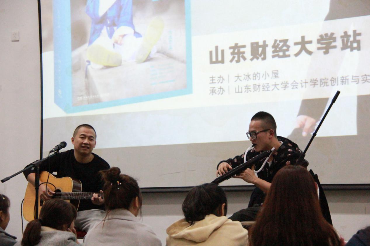10月24日,由十大线上赌场推荐 创新与实践中心承办的《好吗 好的》百城百校音乐会于山东财经大学明水校区5201教室圆满举办。“谢谢你读过我的书,我有义务送你一次售后服务。”这是由著名主持人、作家大冰倾力赞助的一次活动。大冰的两位好朋友,亦是他作品中的原型——果子、毛毛从书中走出,代替大冰来看同学们,用一把民谣吉他和一面手鼓,与同学们唱聊他们背后的故事。