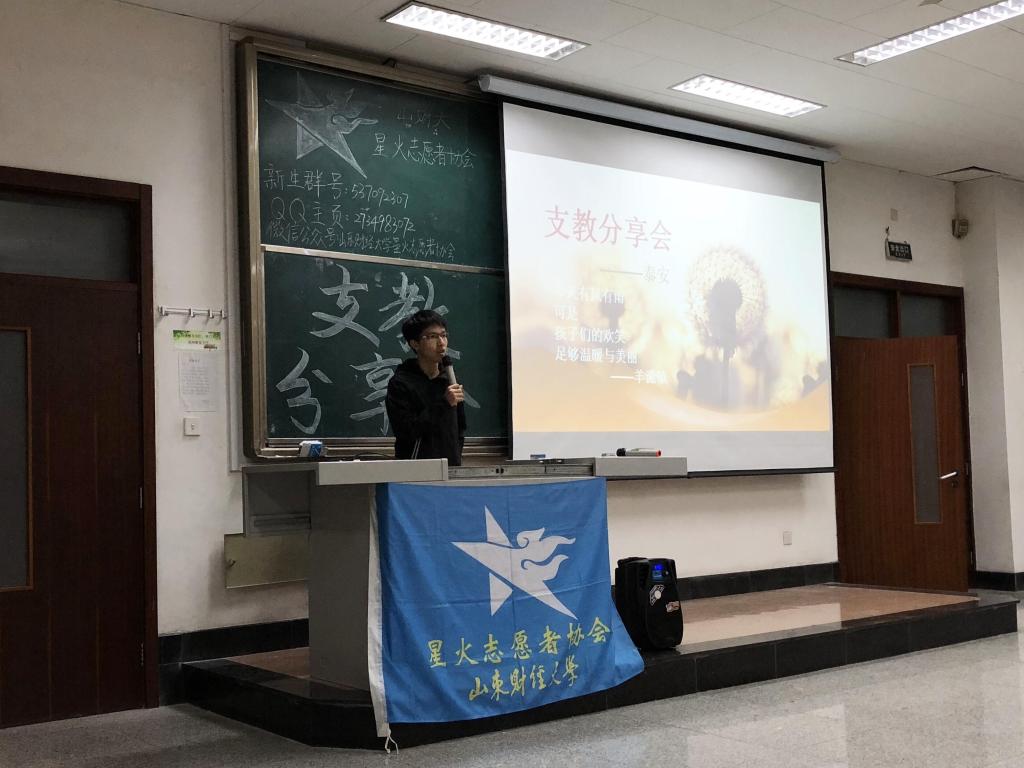 10月10日晚6:30明水4101教室里,山东财经大学星火志愿者协会暑期支教分享会温情召开,怀揣着支教梦的同学们聚集于此,用心聆听支教队员各自的支教故事。支教队员质朴但又不乏趣味得讲述着的,无不是最动人的生活故事和最温热的赤子之心。