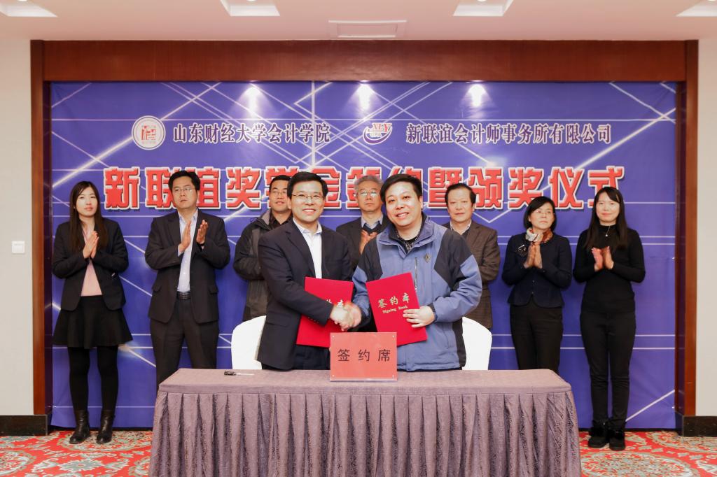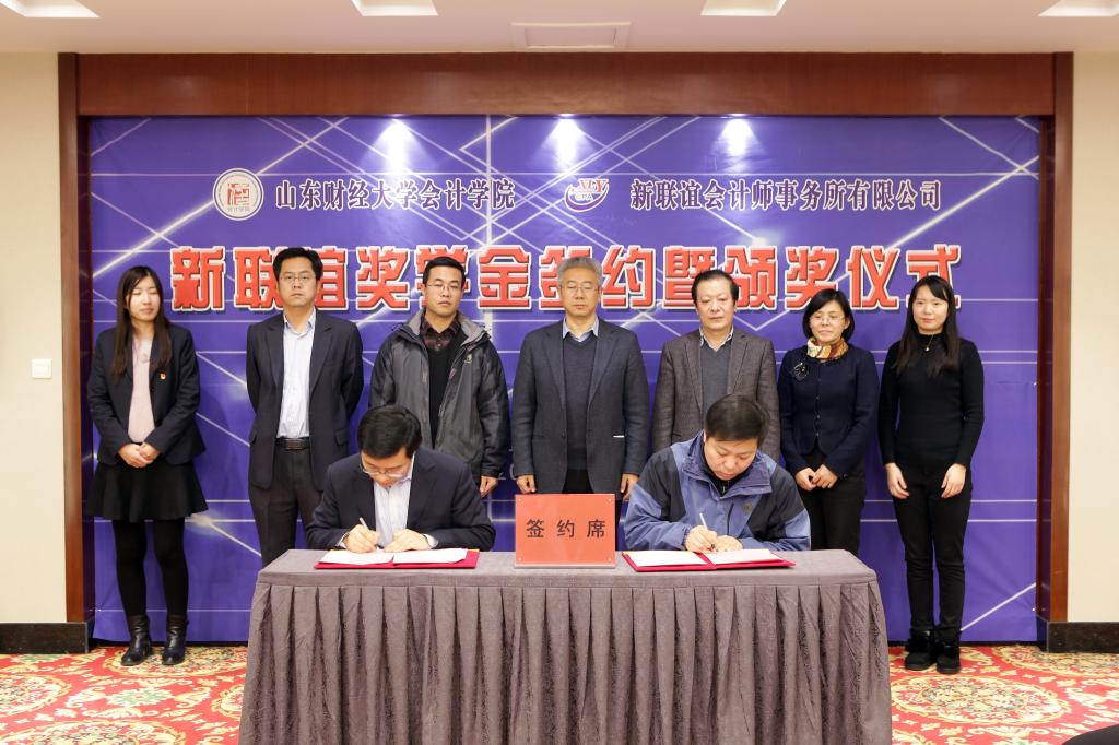 2018年12月12日下午,新联谊奖学金签约暨颁奖仪式在山东财经大学燕山校区学景大酒店二楼会议室举行。山东财经大学副校长张新,新联谊会计师事务所执行总裁刘洪和,人力资源部副部长郭真真,山东财经大学学生处处长王剑,合作发展处处长、校友办公室主任刘奇耀,团委副书记张超,线上赌场 党委书记张涛、副书记付亚、辅导员孙菁以及新联谊奖学金获奖同学参加仪式。
