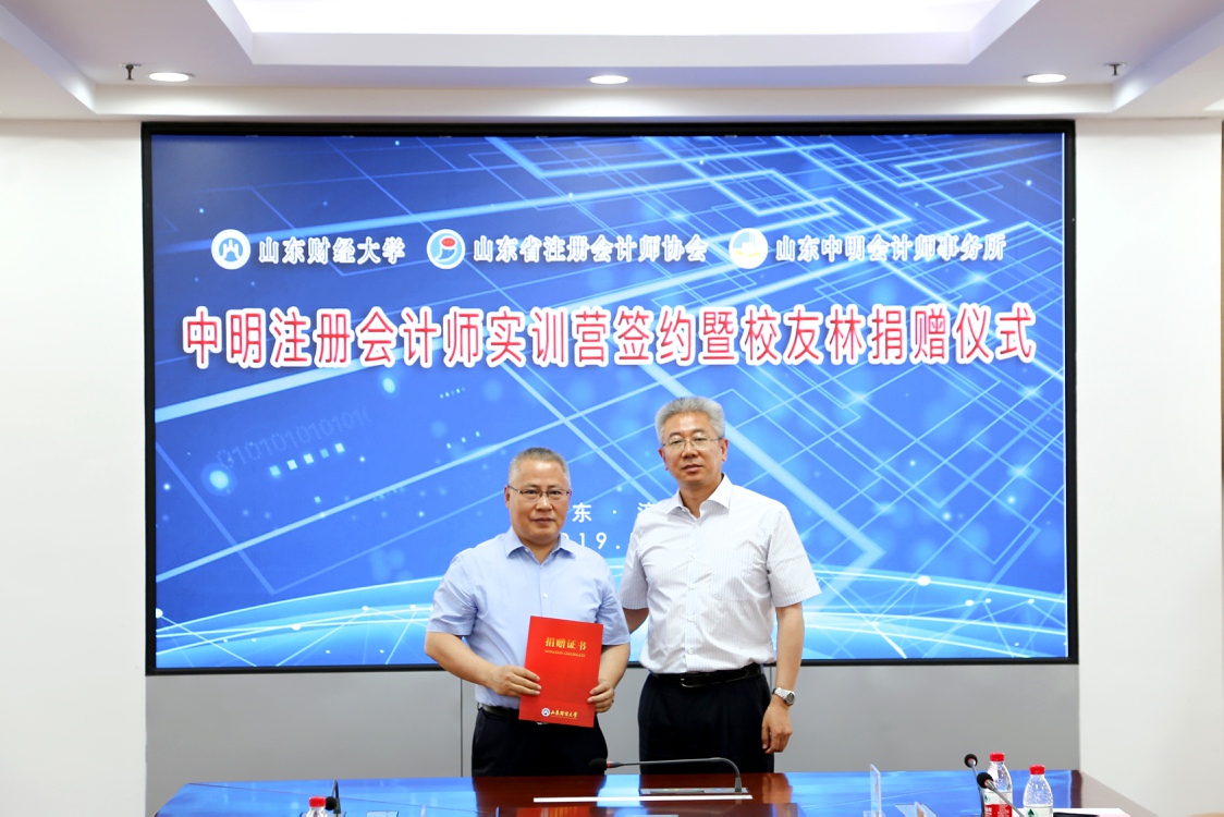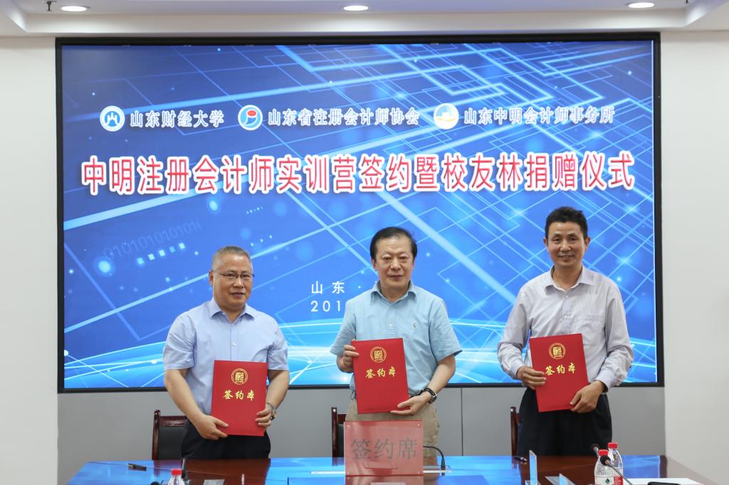 5月24日下午,“中明”会计师方向实训营签约暨校友林捐赠仪式在燕山校区办公楼七楼报告厅举行。山东财经大学副校长张新,山东省注册会计师协会会长韩群、副会长梁仕念,山东中明会计师事务所董事长巴树青、副总经理谷毓、部门经理王燕琳,十大线上赌场推荐 党委书记张涛,就业处处长杨哲,发展与合作处处长刘奇耀,团委副书记张超,学生处副处长董瑞华,合作发展处副处长徐超、邵伟然,合作共建办公室主任何珅,线上赌场 党委副书记付亚,就业办主任史岩和中明实训营学员30人参加活动。活动由张涛主持。