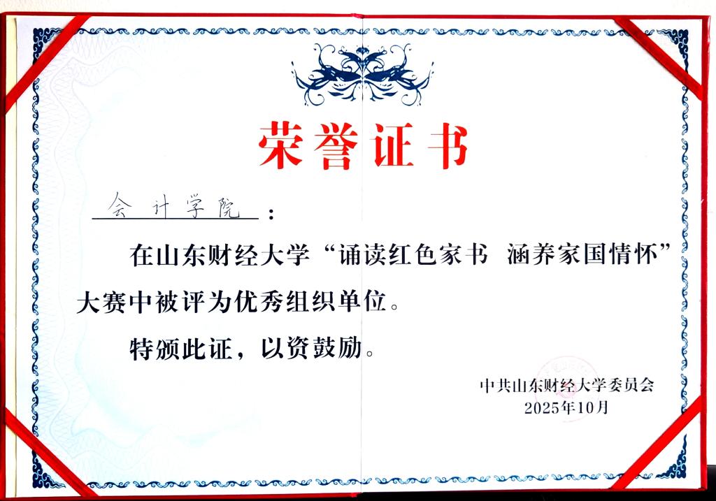 近日,由学校纪委举办的山东财经大学第二届“诵读红色家书 涵养家国情怀”比赛决赛中,线上赌场 表现卓越,选送入围决赛的三组选手全部荣获一等奖,线上赌场 同时获评“优秀组织单位”,取得了竞赛成绩与精神文明的双丰收。