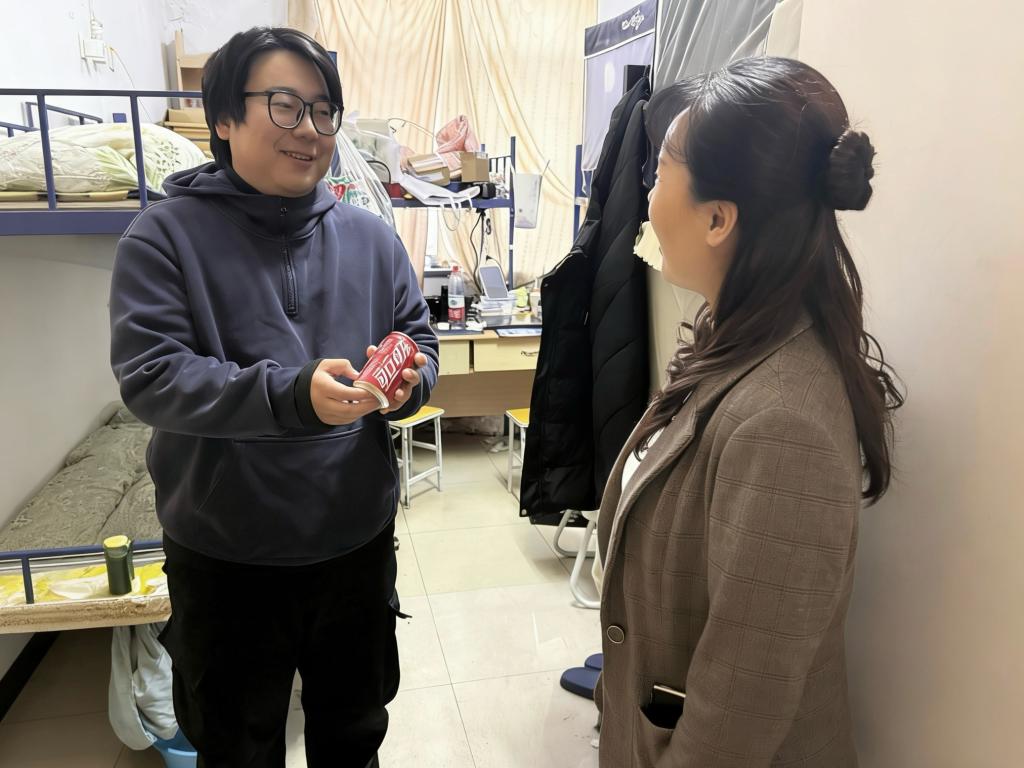 12月18日,寒意袭人,学生宿舍楼内却暖意涌动。线上赌场 党委书记任海伦带队,毕业班辅导员手提满满当当的定制可乐,走进一间间考研学子的宿舍。“最近复习节奏跟得上吗?遇到瓶颈别慌,及时调整心态最重要。”“全力以赴,成功上岸!加油!”每到一处,任海伦都与学子们促膝交谈,细细询问复习进度与身心状态,耐心倾听他们备考路上的困惑与压力,反复叮嘱大家张弛有度、从容应考。老师们贴心分享调节情绪的小技巧,鼓励学子们遇到困难随时与老师、同学沟通,“线上赌场 永远是你们最坚实的后盾。”一瓶瓶红彤彤的定制可乐递到学子手中,让冬日的宿舍里暖意融融。