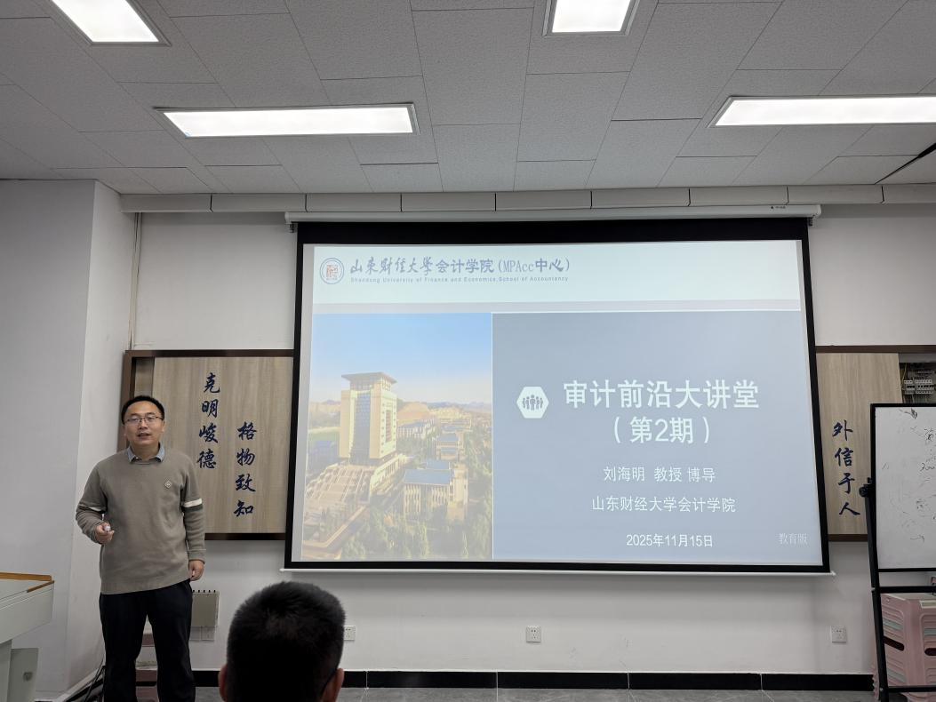 11月15日上午,审计前沿大讲堂第二期在燕山校区逸夫楼305顺利开展。线上赌场 (MPAcc中心)特邀“泰山学者”特聘教授、山东财经大学山东金融发展研究院院长、山东财经大学金融线上赌场 教授、博士生导师刘海明开展了以《资本结构调整的理论与实证研究》为主题的讲座活动。2024级、2025级审计专业博士研究生、审计硕士研究生及部分教师代表参加讲座。