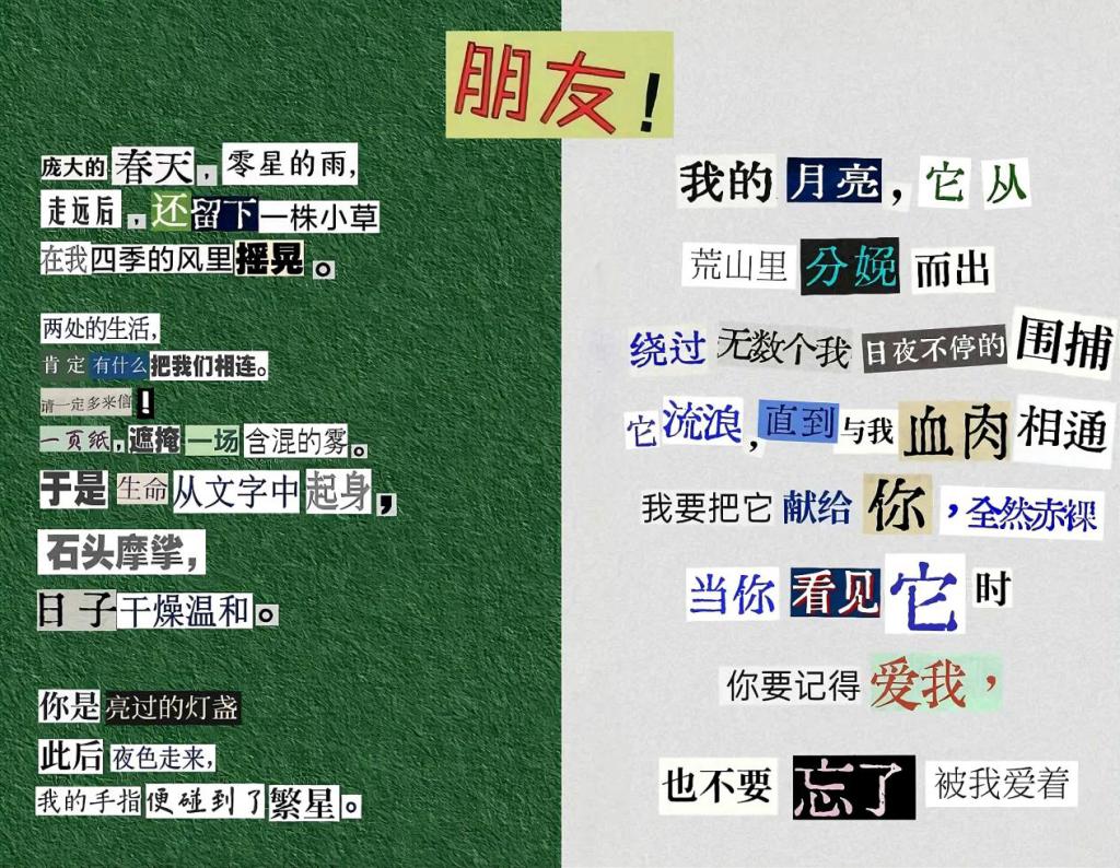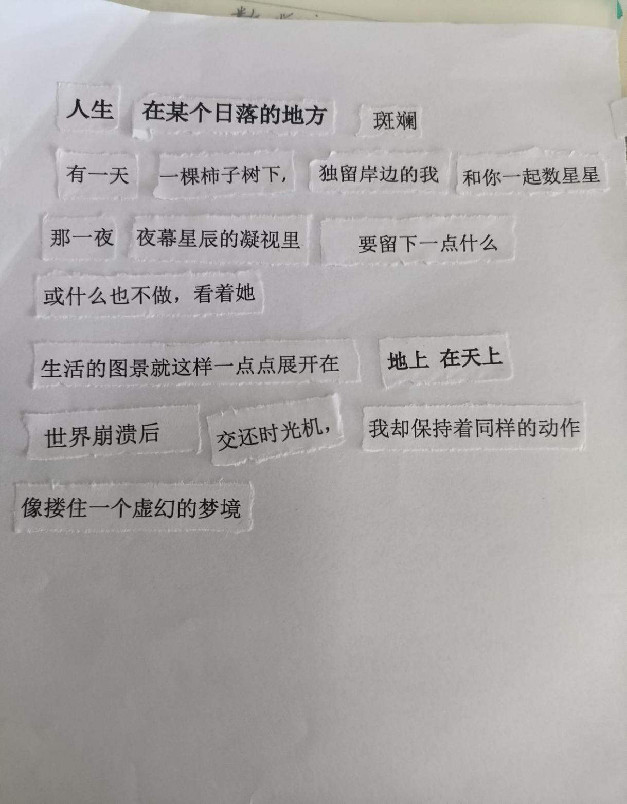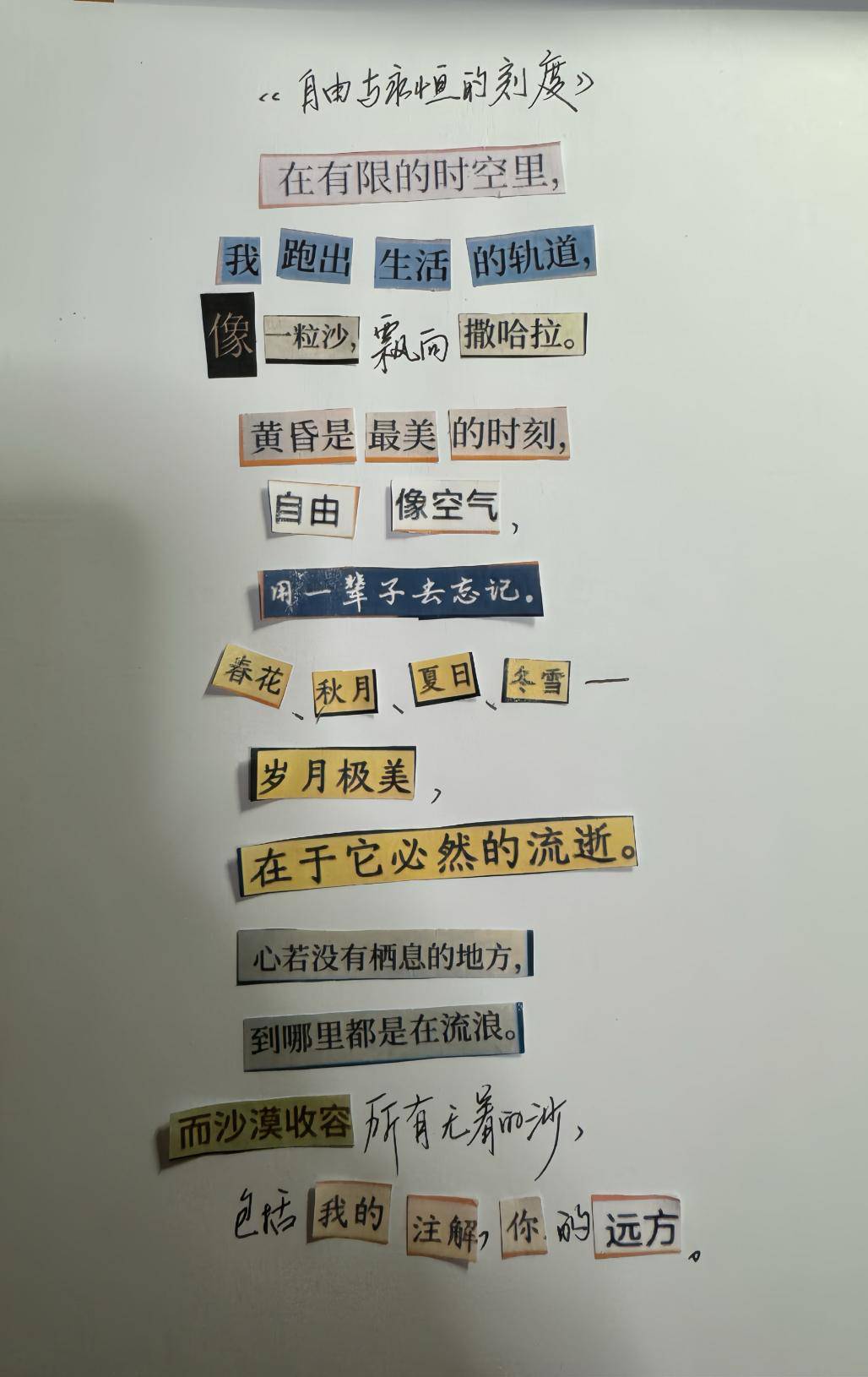 春风轻拂,万物复苏,不仅大自然换上了斑斓的新装,我们的心田也悄然绽放出对生活的无限憧憬。“生活不止眼前的苟且,还有诗和远方的田野。”这句温柔的话语,如同一缕温暖的阳光,穿透日常的琐碎,照亮了我们内心深处对美好事物的向往。让我们在文字的海洋中遨游,用碎片拼接出心中的宇宙,让青春的风采在诗行间跃动。为了让同学们发现生活中的美好,线上赌场 特此举办“意剪生活画,诗写青春风”拼贴诗主题活动。接下来,让我们一起走进22级同学们精心构筑的拼贴诗世界吧。